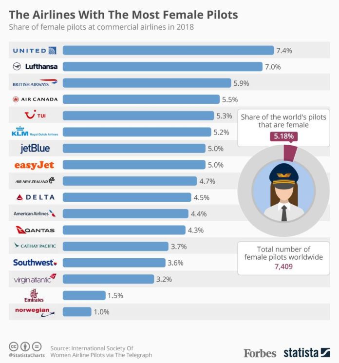 La Sociedad Internacional de Mujeres Piloto de Aerolíneas dice que hay alrededor de 7.409 mujeres pilotos de líneas aéreas en todo el mundo, y que las mujeres representan el 5.18 por ciento de los pilotos en las 34 principales aerolíneas. La siguiente infografía usa esa información, que fue publicada en el Telegraph, para mostrar a las principales aerolíneas con la mayoría de las mujeres piloto. United ocupa el primer lugar, con las mujeres representan el 7,4 por ciento de sus pilotos, seguido por Lufthansa (7,0 por ciento) y British Airways (5,9 por ciento). En el caso de Southwest Airlines, las mujeres piloto solo representan el 3.6 por ciento del conteo total de pilotos de la compañía.
