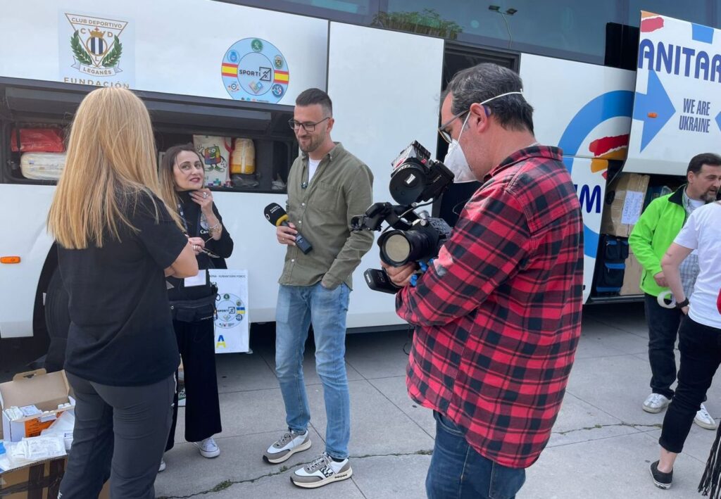 TV en Directo: Un equipo de Madrid Directo -Telemadrid- recogió la salida desde Butarque, el campo de fútbol del C.D. Leganés. En la foto, Laura Giménez y Carmen M. García conversan con el reportero delante del autobús, rotulado con el mensaje de Humanitarian Aid, y logos creados para la ocasión por las organizaciones de la plataforma Sporti.
