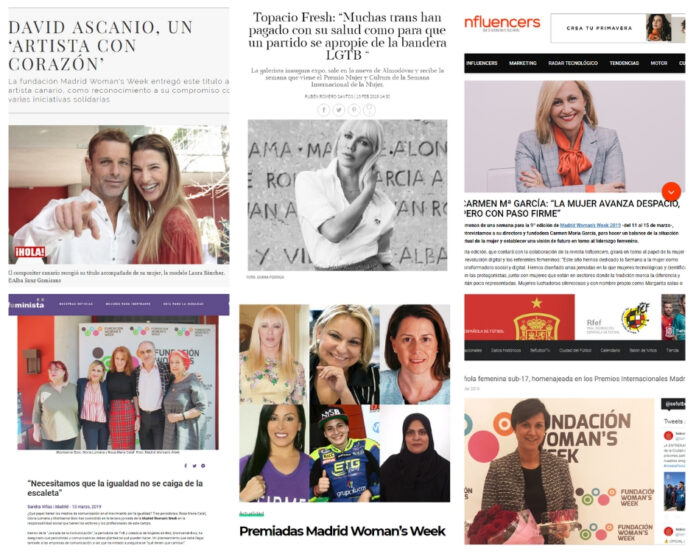 Desde FUNDACIÓN WOMAN’S WEEK queremos dar las gracias a todxs los que habéis hecho posible que Madrid Woman’s Week 2019 fueran un éxito una edición más. A nuestros patrocinadores: La Comunidad de Madrid, Obra Social “la Caixa”, Calidad Pascual, Mastercard, Reale Seguros, Pfizer, Tipsa, Airbus, Atento, HP, al Real Jardín Botánico de Madrid y al resto de entidades y medios de comunicación que han respaldado esta iniciativa un año más y han trabajado codo a codo con nosotrxs por la igualdad de género real y efectiva.