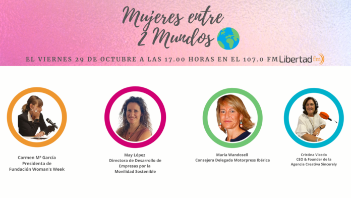 El viernes 29 de octubre a las 17.00 horas Carmen Mª García, presidenta de Fundación Woman’s Week, y Cristina Vicedo, fundadora de Agencia Creativa Sincerely; estarán acompañadas en los estudios de Libertad FM por May López, directora de Desarrollo de Empresa por la Movilidad Sostenible; y María Wandosell, consejera Delegada de Motorpress Ibérica.